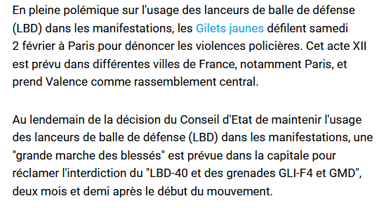 L'acte XII des Gilets jaunes, ce samedi 2 février, sera une "grande marche des blessés" et pour l'interdiction de l'usage des armes LBD. Face à la controverse, le ministre de l'Intérieur a promis vendredi de sanctionner "les abus".